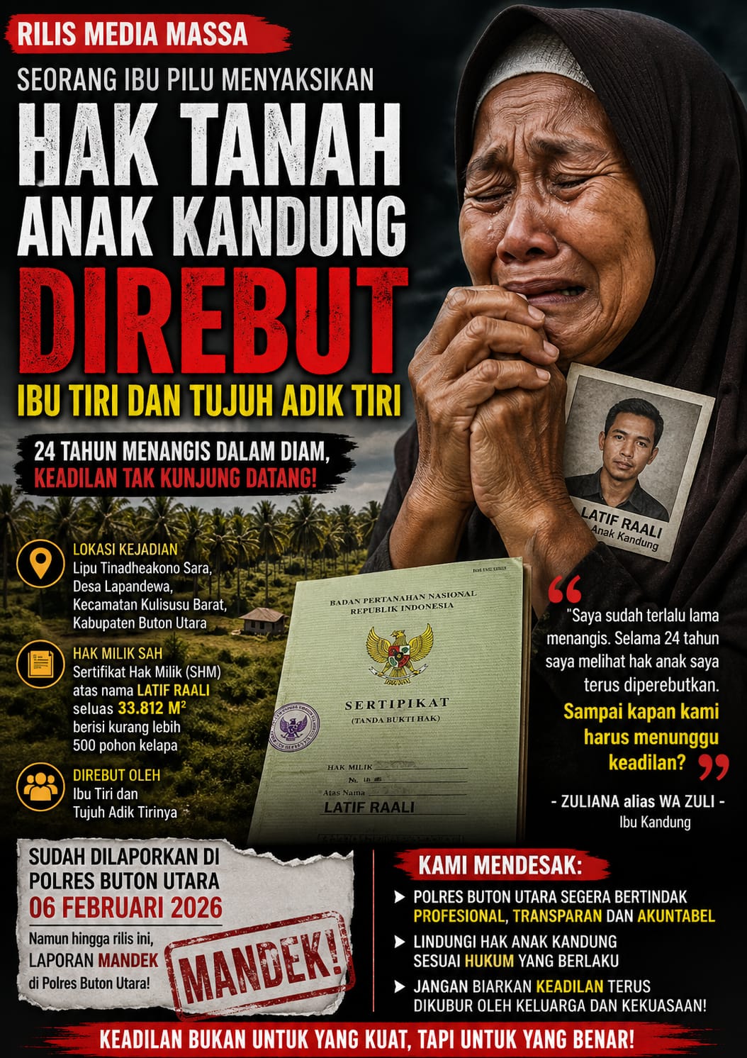 Mengembalikan hak anak kandungnya dan memastikan keadilan tidak mati di tanah Lipu Tinadheakono Sara, Buton Utara. *(Red)*.