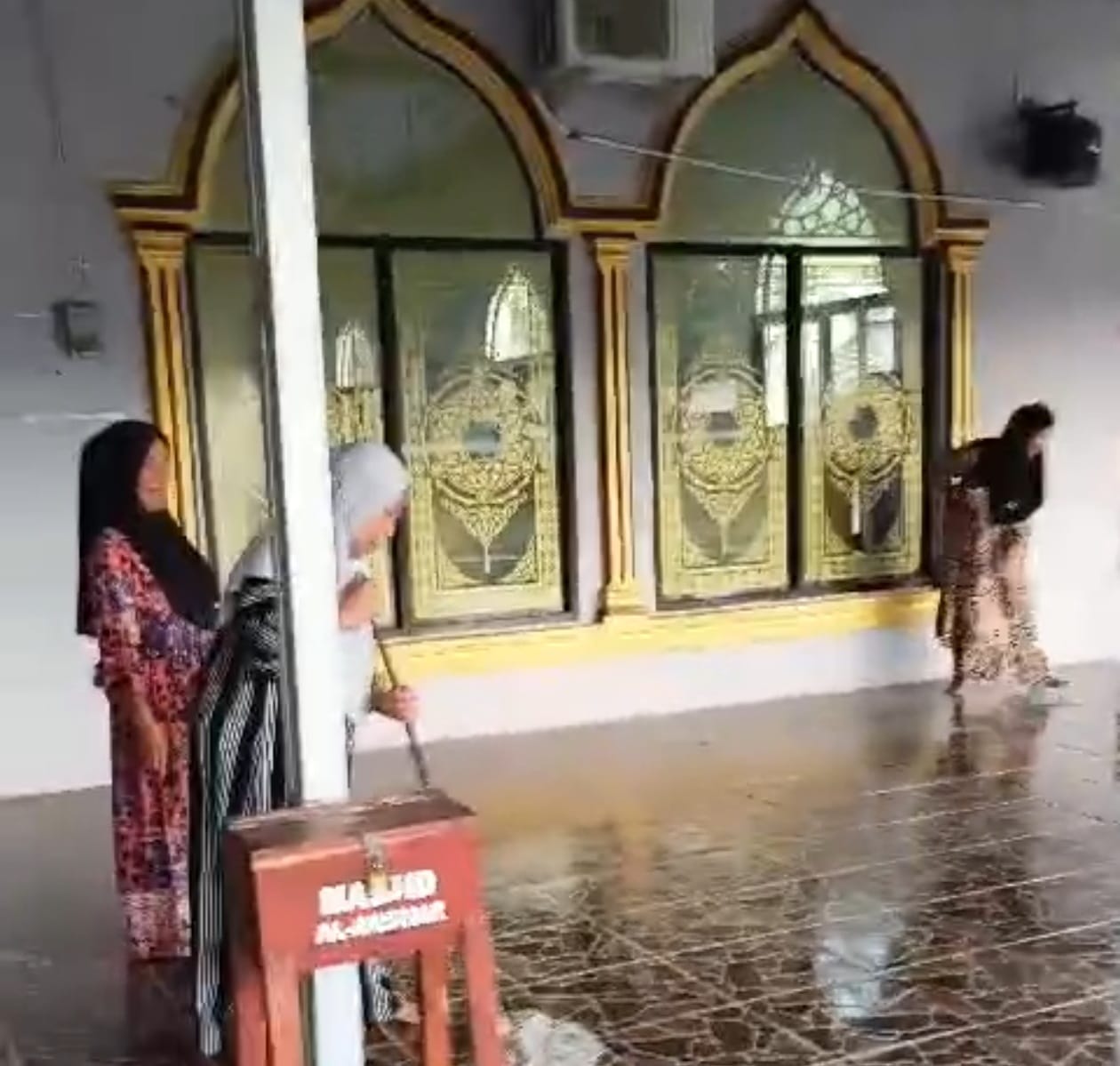 Bersama-sama, mereka melakukan tugas-tugas seperti membersihkan sampah, menyapu lantai, dan mengepel lantai masjid dengan penuh semangat dan kebersamaan.