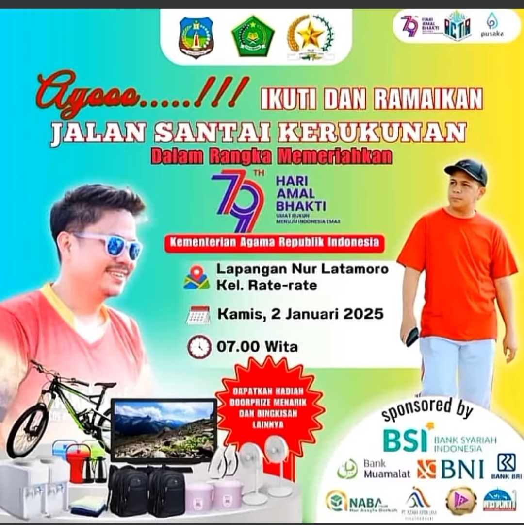 Bupati Kolaka Timur Abdul Azis mengajak warga Kolaka Timur agar ikut serta pada kegiatan jalan santai tersebut. Ayo warga Kolaka Timur mari kita tunjukkan semangat kebersamaan dalam acara Jalan Santai Kerukunan, yang digelar untuk merayakan Hari Amal Bakti ke-79. Ini adalah kesempatan emas bagi kita semua untuk bersatu, bergembira, dan mempererat hubungan antar umat. Dalam perjalanan menuju Indonesia Emas, mari kita jadikan momen ini sebagai langkah nyata dalam memperkuat persatuan dan kerukunan antar sesama ditahun 2025 Ini. Ucapnya.