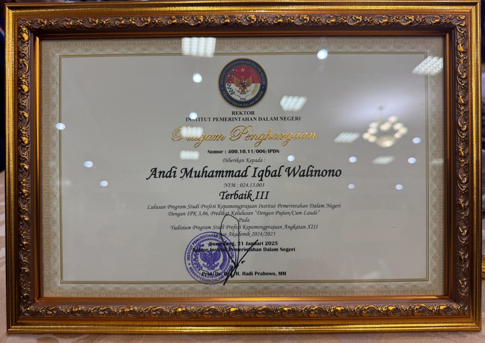 Penghargaan tersebut diserahkan pada acara Yudisium yang berlangsung di Kampus IPDN Jatinangor, Jawa Barat, Kamis (23/1/2025).