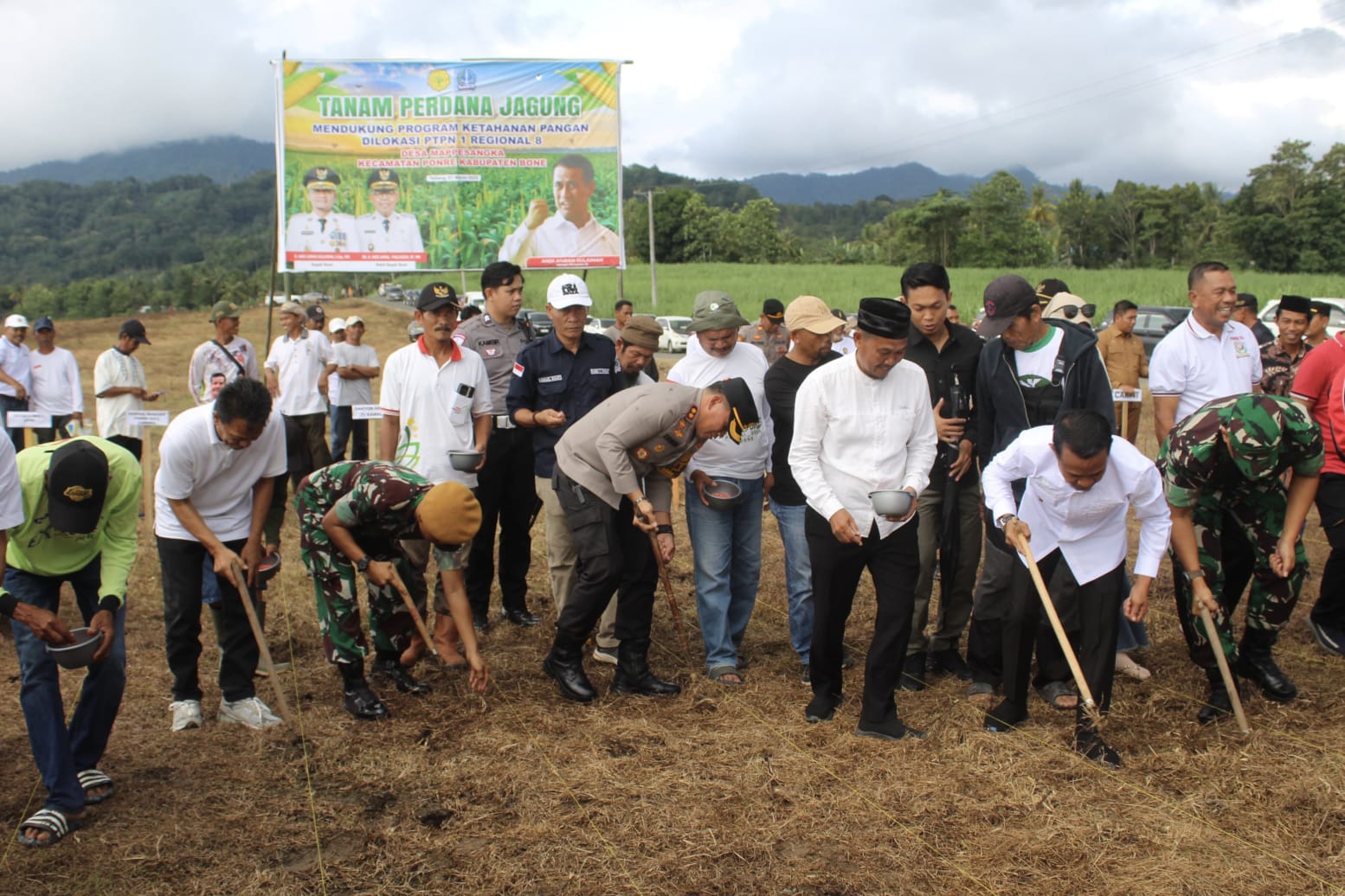 Andi Asman Sulaiman bersama Forkopimda Kabupaten Bone lakukan Tanam Perdana Jagung di Desa Mappesangka, Kecamatan Ponre, Kabupaten Bone, Sabtu (01/03/2025).