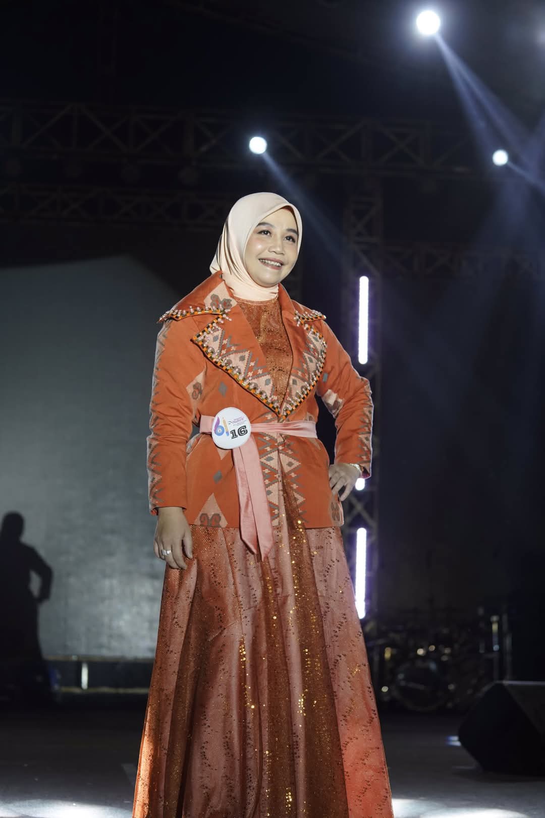 Busana ini berbahan dasar kain tenun berwarna Orange, yang melambangkan semangat, Antusiasme dan kehangatan