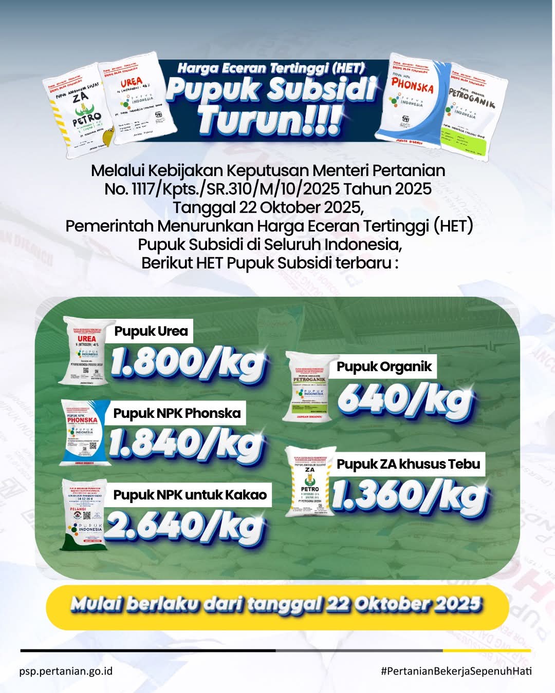 Kementerian Pertanian menetapkan kebijakan tersebut melalui Keputusan Menteri Pertanian Nomor 1117/Kpts./SR.310/M/10/2025 yang berlaku untuk seluruh jenis pupuk bersubsidi di Indonesia.