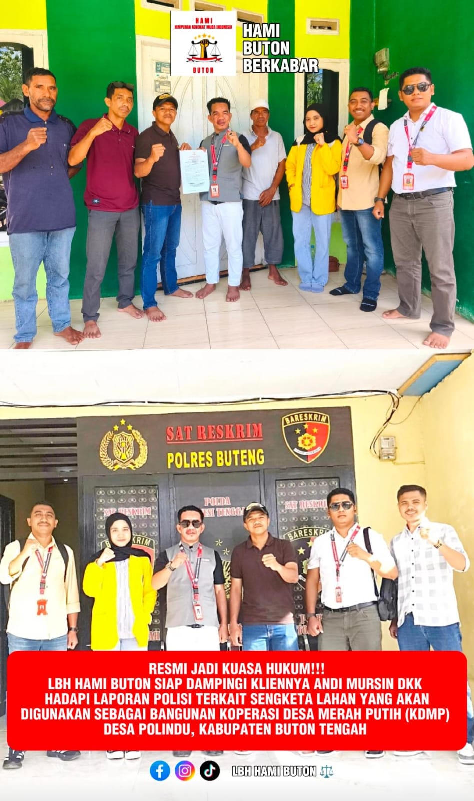 BUTON TENGAH-LENSASATU. Com. ||. Pemilik Lahan Resmi Gandeng Lembaga Bantuan Hukum Himpuman Advokat Muda Indonesia Sulawesi Tenggara Cabang Buton (LBH HAMI Buton) usai dilaporkan oleh Kepala Desa Polindu yang didampingi oleh Penasehat Hukum dan Kabag Hukum Pemda Buton Tengah di Polres Buton Tengah terkait dugaan pengrusakan di lokasi pembangunan Koperasi Desa Merah Putih (KDMP) Desa Polindu, Kecamatan Mawasangka, Kabupaten Buton Tengah, Jum’at (27/03/2026).