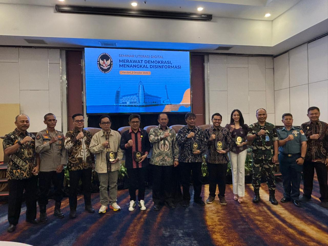 KENDARI – LENSASATU.COM.|| Deputi Bidang Komunikasi dan Informasi (Kominfo) Kemenko Polkam, Marsekal Muda TNI Eko Dono Indarto, membuka Seminar Literasi Digital bertajuk “Merawat Demokrasi, Menangkal Disinformasi” di Kota Kendari, Kamis (2/10/2025).