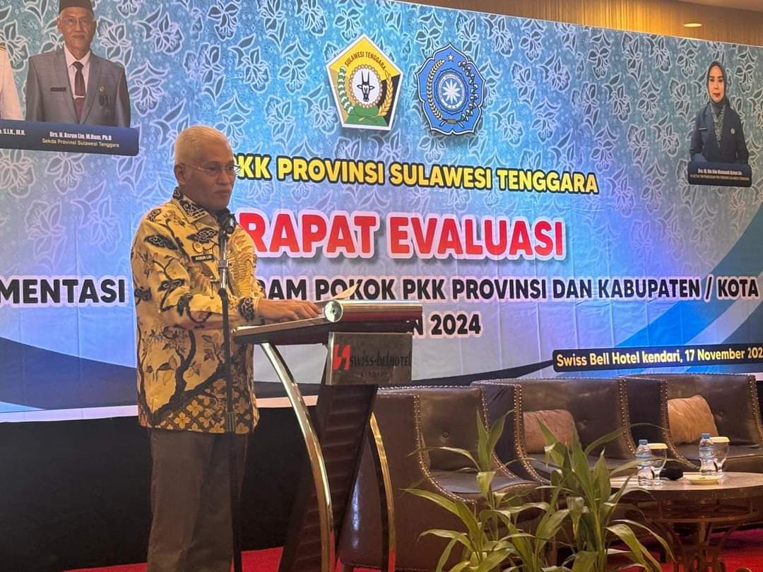 KENDARI, LENSASATU.COM||Mewakili Pj Gubernur, Komjen Pol. (P) Dr (H.C) Andap Budhi Revianto.,S.I.K.,M.H, Sekda Sultra, Drs. H Asrun Lio.,M.Hum.,Ph.D turut memberikan sambutan pada pembukaan rapat evaluasi implementasi 10 program pokok PKK Provinsi Sultra bersama TP PKK 17 kabupaten kota Provinsi Sultra, Minggu (17/11/2024), di Kendari.