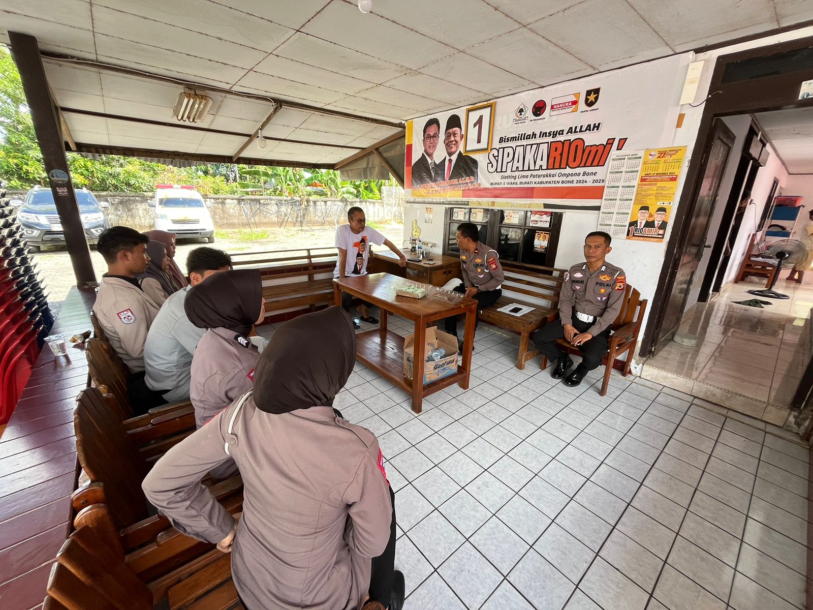 BONE, LENSASATU.COM Kanit Kamsel Satlantas Polres Bone IPDA Sasram bersama anggota, melakukan kegiatan koordinasi dengan tim pemenangan atau LO para pasangan Calon Bupati dan Wakil Bupati Bone, Rabu (13/11/2024).