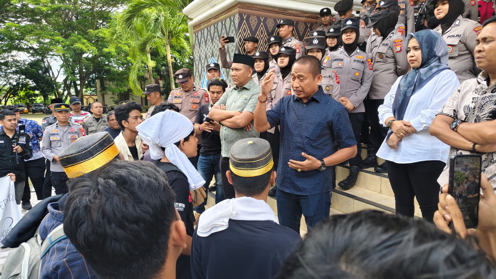 ” Saya sangat apresiasi aksi adik adikku karena membawa suara rakyat. Tetapi jangan buat ricuh, karena kalau di dalam kalian membuat ricuh jangan salah kami kalau bertindak, ” Jelas Andi Akbar.