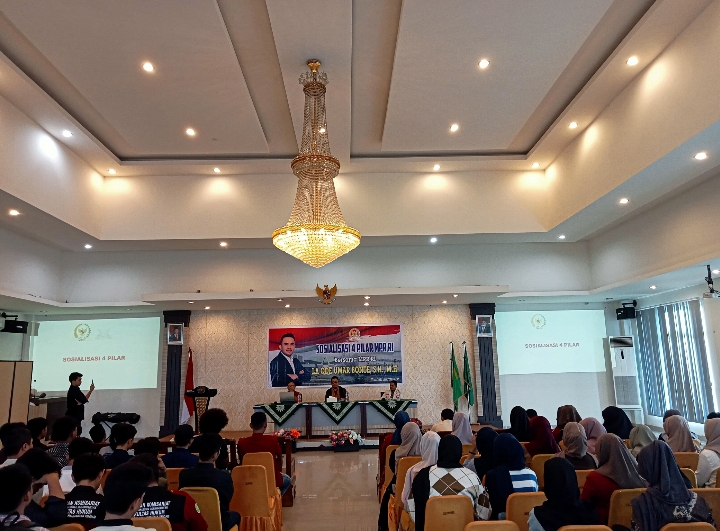 KENDARI-LENSASATU. COM. || Pemuda Muhammadiyah Kota Kendari Gelar Sosialisasi 4 Pilar MPR RI, Bersama MPR RI La Ode Umar Bonte, SH., M.H. Bertempat Aula UM Kendari, pada Jum’at (25/4/2025).