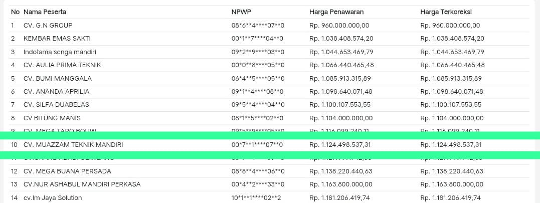 Namun, dalam praktiknya, pemenang tender RSUD Tenriawaru justru bukan dari tiga besar penawaran terendah. Pemenang berada di posisi ke-10, dengan nilai penawaran di atas mayoritas pesaingnya.