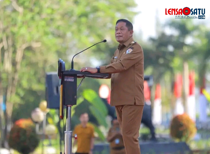 KENDARI-LENSASATU. COM. ||. Wakil Gubernur Sulawesi Tenggara, Ir. Hugua, memimpin Apel Gabungan Aparatur Sipil Negara (ASN) lingkup Pemerintah Provinsi Sulawesi Tenggara di Lapangan Kantor Gubernur, Senin (4/8/2025). Apel ini diikuti oleh Sekretaris Daerah Sultra, Staf Ahli Gubernur, para Asisten, Kepala OPD, Kepala Biro, pejabat struktural dan fungsional, serta ribuan ASN dari berbagai instansi di lingkungan Pemprov Sultra.