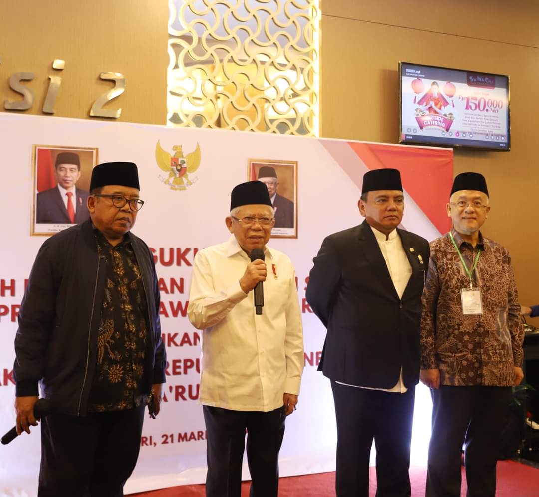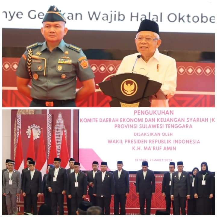 KENDARI-LENSASATU. COM. ||. Wakil Presiden (Wapres) Republik Indonesia (RI), Prof. Dr. K.H. Ma’ruf Amin bersama Pejabat (Pj.) Gubernur Sulawesi Tenggara (Sultra), Komjen Pol. (P) Dr. (H.C) Andap Budhi Revianto, S.I.K.,M.H, menghadiri pengukuhan Komite Daerah Ekonomi dan Keuangan Syariah (KDEKS) Prov. Sultra pada tahun 2023-2025 di Phinisi Ball Room Hotel Claro Kendari pada, Kamis (21 Maret 2024).