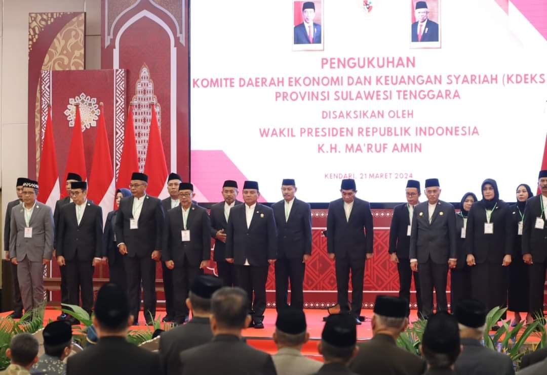 Selanjutnya, Prosesi Pengukuhan Komite Daerah Ekonomi dan Keuangan Syariah (KDEKS) Prov. Sultra yaitu : Kepala Biro Kesejahteraan Rakyat Setda Prov. Sultra, Kepala Biro Perekonomian Setda Prov. Sultra, Kepala Dinas Kesehatan Prov. Sultra, Kepala Dinas Pelayanan Terpadu dan Satu Pintu Prov. Sultra, Kepala Dinas Tenaga Kerja dan Transmigrasi Prov. Sultra, Kepala Dinas Kelautan dan Perikanan Prov.Sultra, Kepala Dinas Ketahanan Pangan Prov. Sultra, Kepala Dinas Ketahanan Pangan dan Peternakan Sultra, Kepala Dinas Perindustrian dan Perdagangan Sultra, Kepala Dinas Koperasi, Usaha Kecil dan Menengah Sultra, Kepala Dinas Pariwisata Sultra, Kepala Dinas Komunikasi dan Informatika Prov. Sultra, Kepala Badan Pengelolaan Keuangan dan Aset Daerah Prov. Sultra, Kepala Badan Perencanaan dan Pembangunan Prov. Sultra, Inspektur Prov. Sultra, Asisten Administrasi Umum Setda Prov. Sultra, Asisten Pemerintahan dan Kesejahteraan Rakyat Setda Prov. Sultra, Asisten Perekonomian dan Pembangunan Setda Prov. Sultra, Sekretaris Daerah Prov. Sultra dan Pj. Gubernur Sultra oleh Plt. KDEKS, Taufik Hidayat, membacakan Surat Keputusan Gubenur Sultra Nomor : 534 Tahun 2023, tanggal 4 September 2023 tentang pembentukan Komite Daerah Ekonomi dan Keuangan Syahriah Prov. Sultra tahun 2023-2025 dalam rangka pelaksanaan fungsi organisasi KDEKS bersama dengan seluruh jajaran Pemprov. Sultra yang disaksikan langsung Wakil Presiden