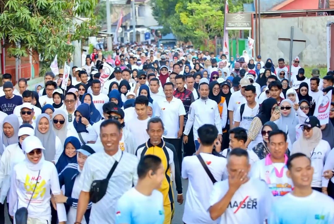 Ribuan warga dari berbagai penjuru Bone memenuhi jalan dengan wajah ceria, ikut serta dalam gerak jalan sehat Anti Malas Gerak (Anti Mager).