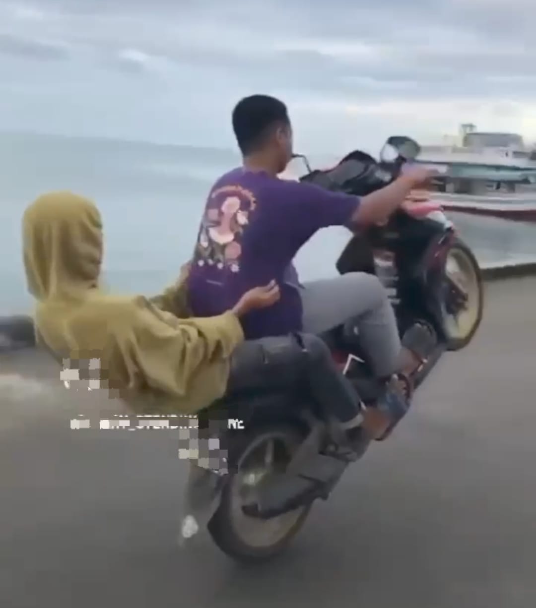 Dalam video tersebut, tampak pengendara motor berboncengan yang diduga masih berusia belasan tahun itu tengah mengangkat ban depan motornya atau free style di tengah jalan.
