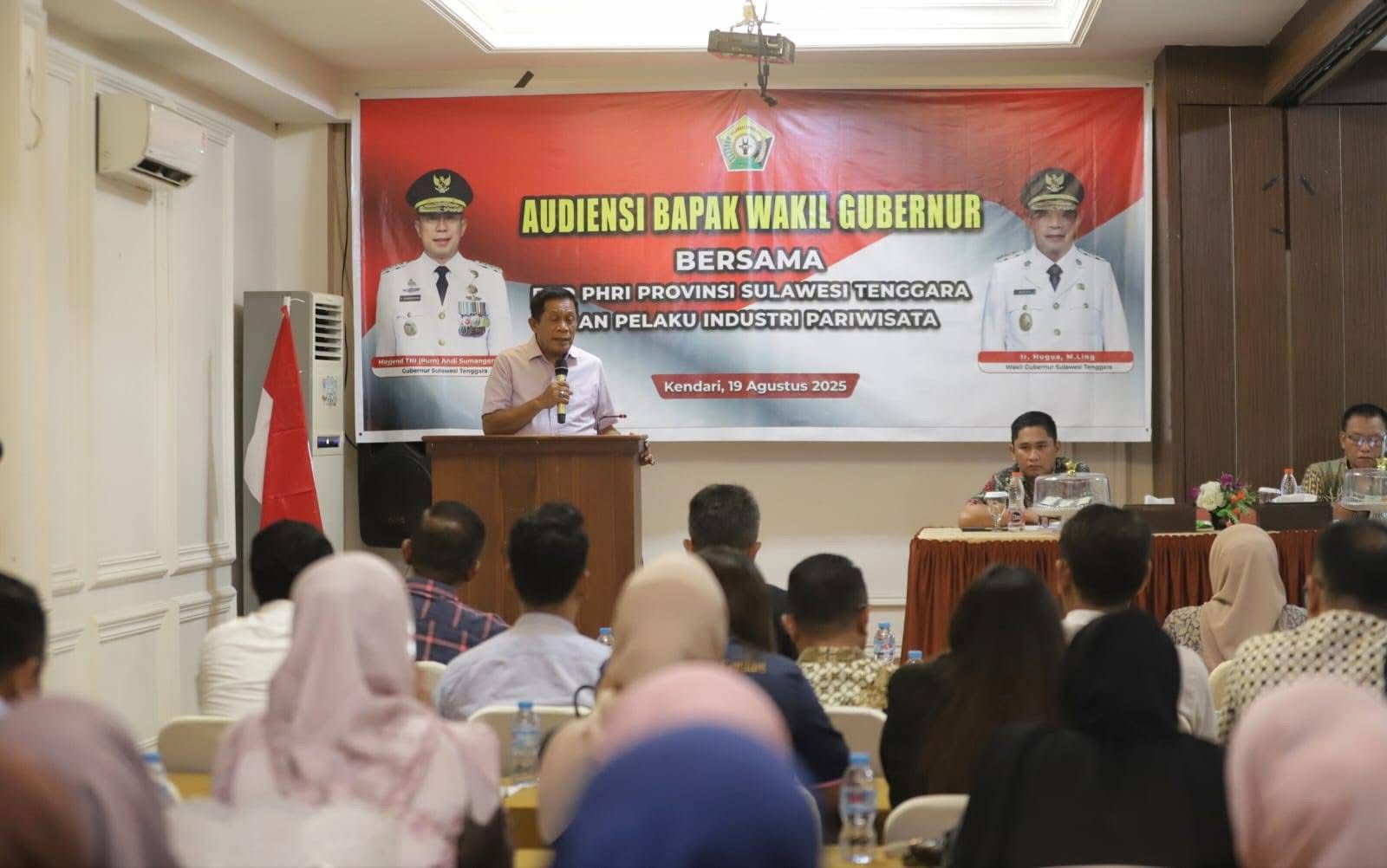 Dalam keterangannya kepada awak media, Wakil Gubernur Sultra Ir. Hugua, menyampaikan bahwa audiensi tersebut dihadiri oleh komunitas pariwisata yang terdiri dari BPD PHRI, HPI, ASITA, pelaku travel, para chef dan Seluruh elemen pariwisata ini berkumpul untuk memastikan kesiapan menyukseskan dua event nasional, yakni Rakorda Produk Hukum Daerah dan STQH Nasional XXVIII. Dari aspek perhotelan, sekitar 3.400 kamar mulai dari kelas 1, hotel berbintang hingga homestay berkelas telah disiapkan. Selain itu, pelaku usaha juga sepakat tidak menaikkan tarif secara berlebihan, mengangkat kuliner tradisional sebagai identitas daerah, serta menyiapkan paket tur ke berbagai kabupaten/kota lengkap dengan transportasi, keamanan, dan standar pelayanan yang memadai.