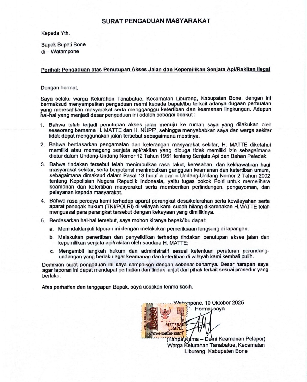 Pengaduan tersebut ditujukan langsung kepada Bupati Bone dengan perihal “Penutupan Akses Jalan”, disertai permintaan agar pemerintah daerah turun langsung memeriksa kondisi di lapangan dan mengambil tindakan sesuai aturan yang berlaku.